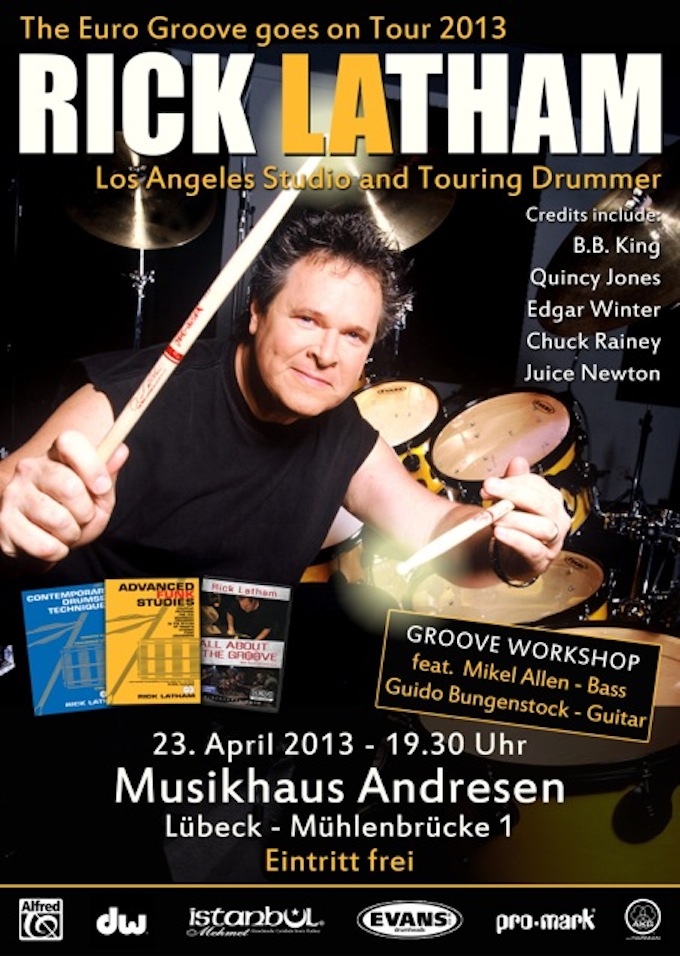 Rick Latham, one of the most distinctive Drummer worldwide played a Drum Groove Clinic on March 15th 2012 at Music Store Andresen / Lübeck. He was assisted by Mikel Allen on bass and Guido Bungenstock for a fat groove. Rick Latham worked with artists like Chuck Rainey, B.B. King, Rick Derringer, Howard Roberts and was a member of the Edgar Winter Band. His books “Advanced Funk Studies, Contemporary Drum Techniques” & “All about the Groove ” are milestones for drum teaching.