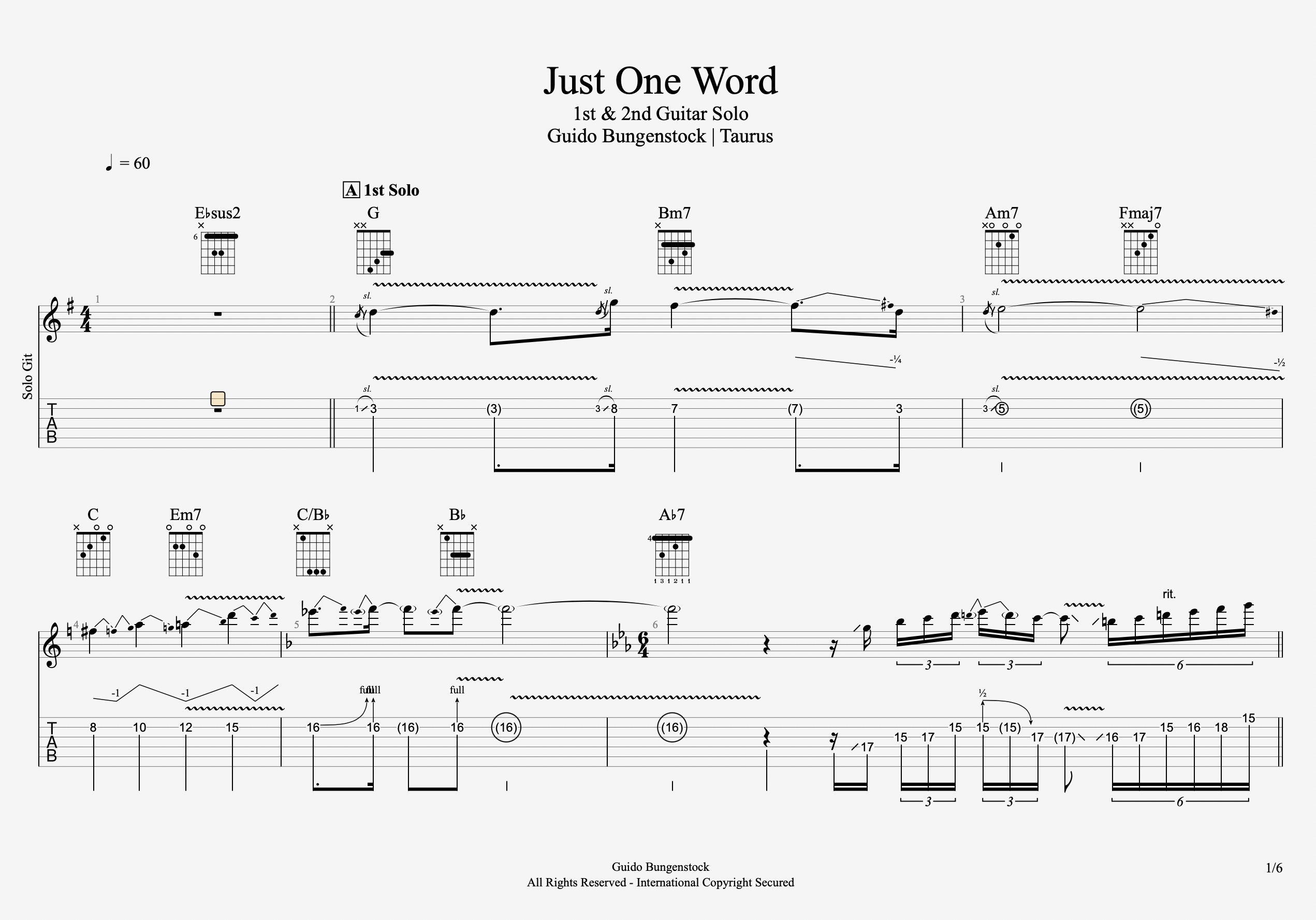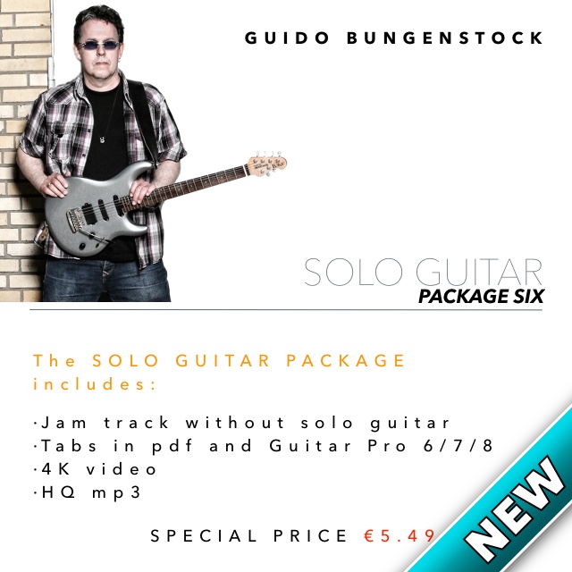 In this new power ballad “Just One Word” of his band Taurus, Guido Bungenstock showcases 2 tasteful solos using a variety of playing techniques, including advanced bending, vibrato bar technique, slides, speed picking, and much more. Blues-inspired licks also feature prominently in this ballad, perfectly complementing this Solo Guitar Package Six.