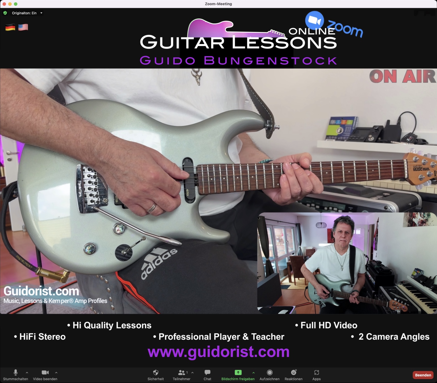 Guido Bungenstock bietet maßgeschneiderten Online Gitarrenunterricht mit Schwerpunkt Rockgitarre via Zoom® (Download) an. Der Online Unterricht für E-Gitarre basiert auf dem Konzept amerikanischer Musikinstitute und legt ganz bewusst den Schwerpunkt auf praxisgerechtes Spielen ohne dabei die notwenige Theorie zu vernachlässigen. Ein erfolgreiches Unterrichtskonzept welches sich seit Jahren bewährt und Spass macht.