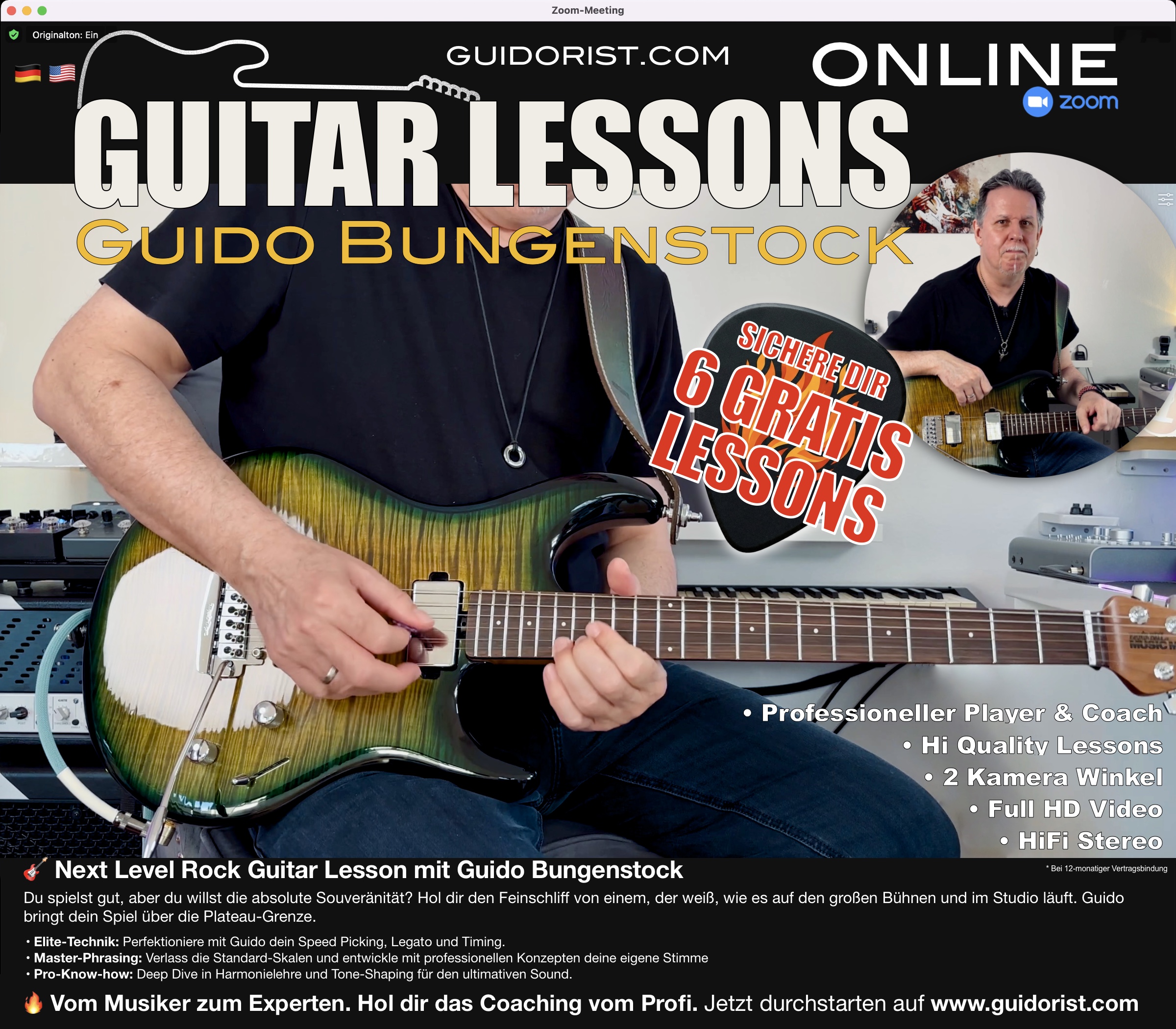 Guido Bungenstock bietet maßgeschneiderten Full HD Online Gitarrenunterricht mit Schwerpunkt Rockgitarre via Zoom® (Download) an. Der Online Unterricht für E-Gitarre basiert auf dem Konzept amerikanischer Musikinstitute und legt ganz bewusst den Schwerpunkt auf praxisgerechtes Spielen ohne dabei die notwenige Theorie zu vernachlässigen. Ein erfolgreiches Unterrichtskonzept welches sich seit Jahren bewährt und Spass macht.